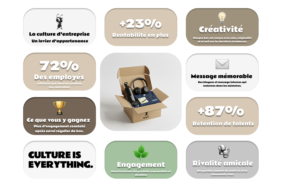 Nous sommes les artisans d'une nouvelle ère pour la culture d'entreprise. Chez KULT., nous croyons que la vraie cohésion d'équipe ne se construit pas avec des objets standards, mais avec des expériences uniques et mémorables.